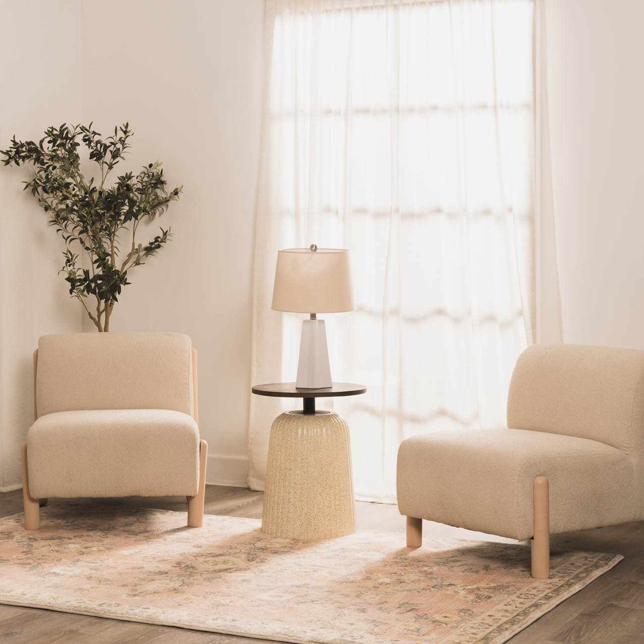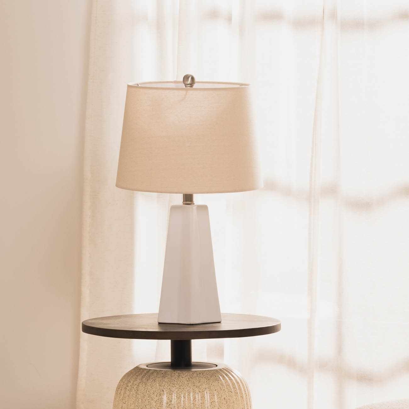 | Material: | Body: Ceramic / Shade (Outside): Linen / Shade (Inside): Polyester / Finial: Iron |
